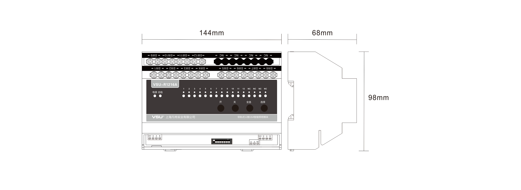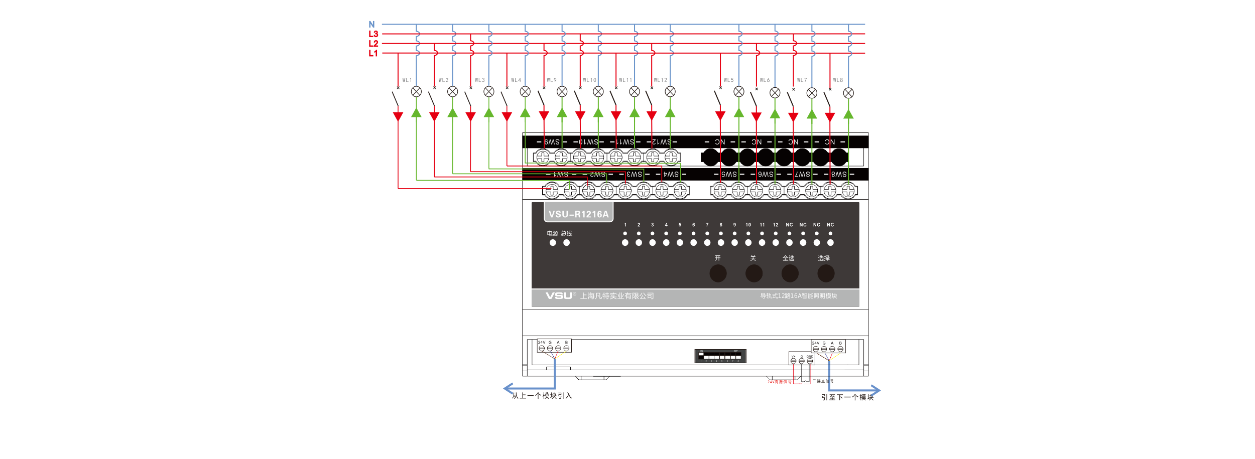 本產(chǎn)品為導(dǎo)軌式安裝,含12路智能繼電器,每回路可獨(dú)立控制3520W燈具的開關(guān),帶應(yīng)急按鍵,LED燈實(shí)時指示各個回路開關(guān)狀態(tài),可設(shè)置為互鎖控制6組窗簾開合; |
