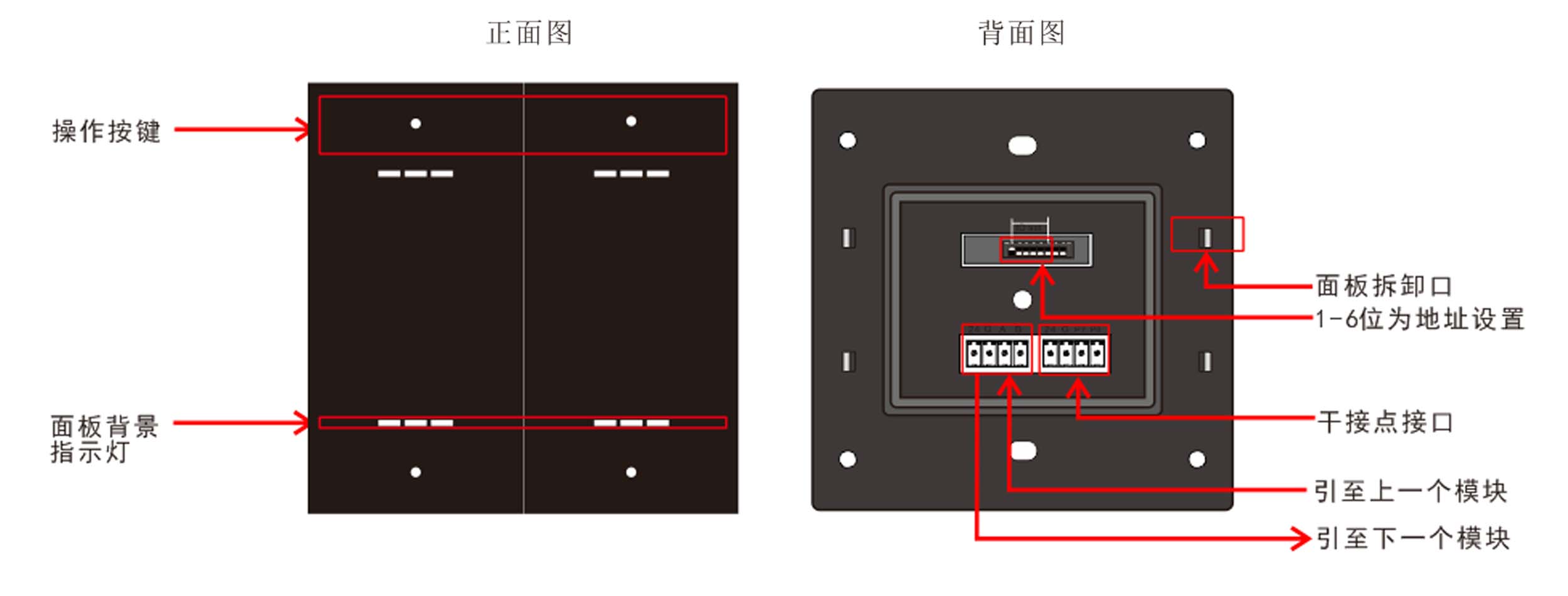標準86底盒安裝,支持無縫聯(lián)接,提供4鍵,每個按鍵帶1路LED指示燈,復(fù)位式輕觸開關(guān),結(jié)構(gòu)成熟,性能穩(wěn)定,標準工藝,采用塑料材質(zhì)(顏色可選灰色、黑色和香檳金);自帶感應(yīng)式背光燈;提供兩路IO輸入可外接傳感器。